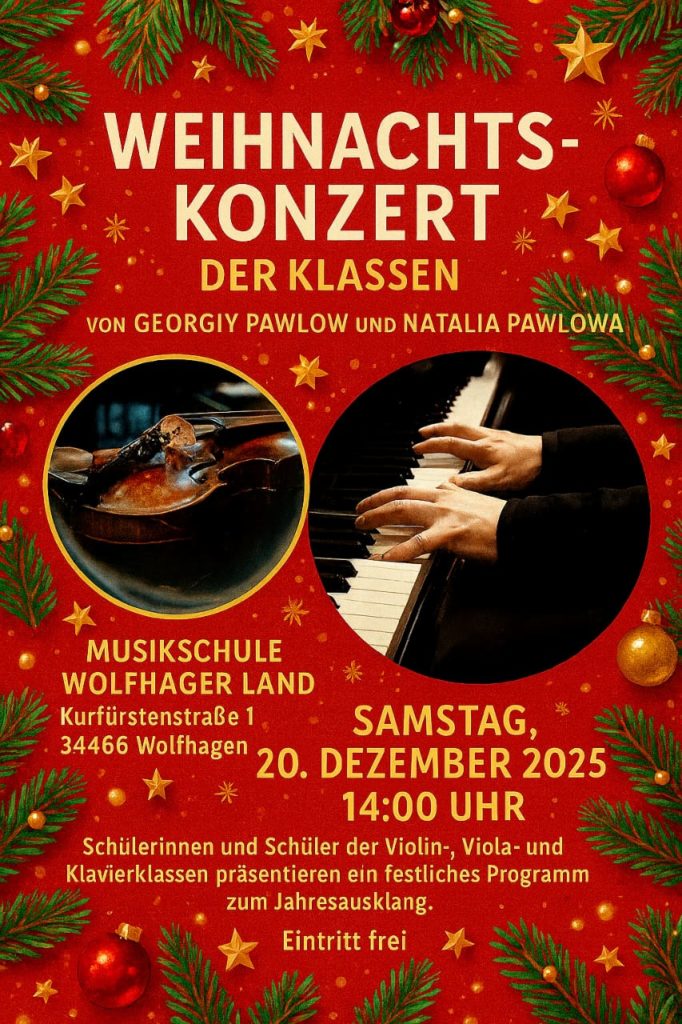 Weihnachtskonzert 13. Dezember 2025 Schülerinnen und Schüler der Violin-, Viola- und Klavierklassen von Georgiy Pawlow und Natalia Pawlowa präsentieren am Samstag, 20. Dezember 2025 ein festliches Programm zum Jahresausklang.